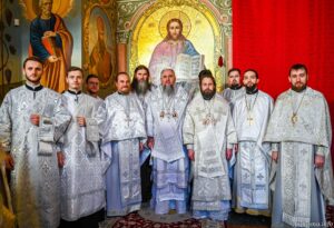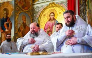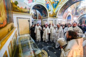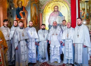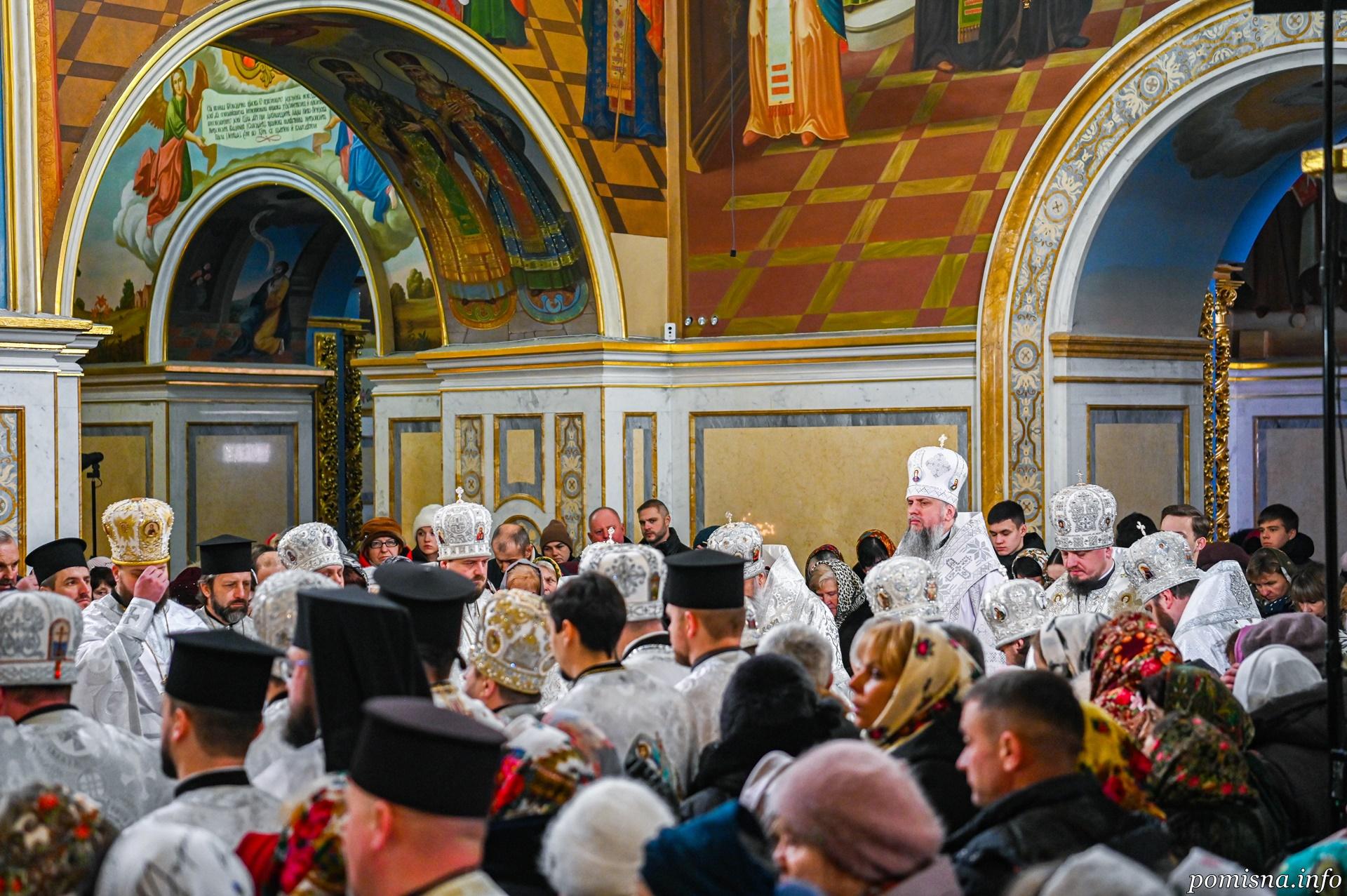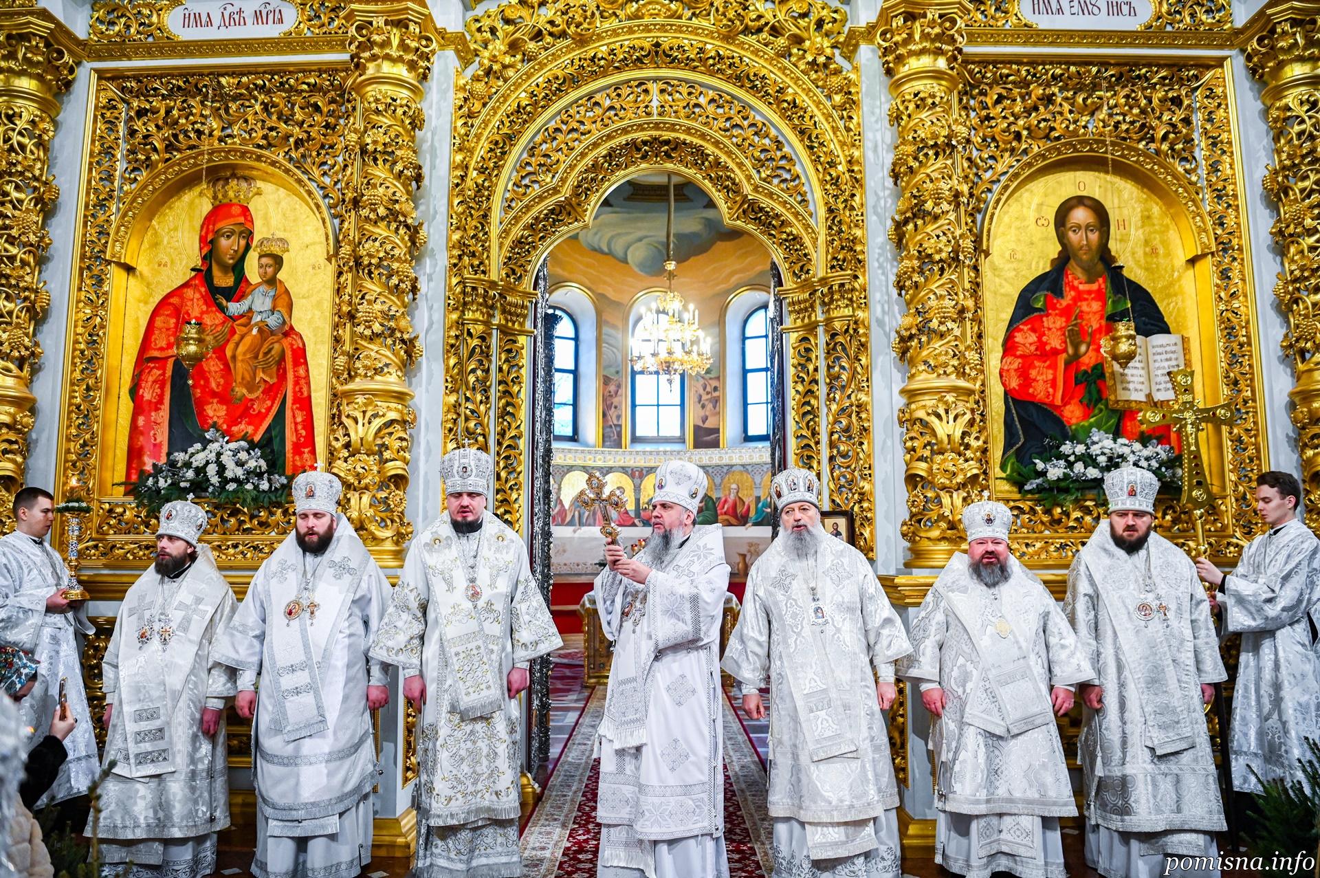 Предстоятелю автокефальної Української Православної Церкви співслужили архієпископ Луганський і Старобільський Лаврентій, єпископ Житомирський і Овруцький Паїсій, єпископ Чернігівський і Ніжинський Антоній, єпископ Васильківський Єфрем, єпископ Богуславський Арсеній, намісник Лаври єпископ Бориспільський Авраамій, всечесна братія монастиря та запрошене духовенство.